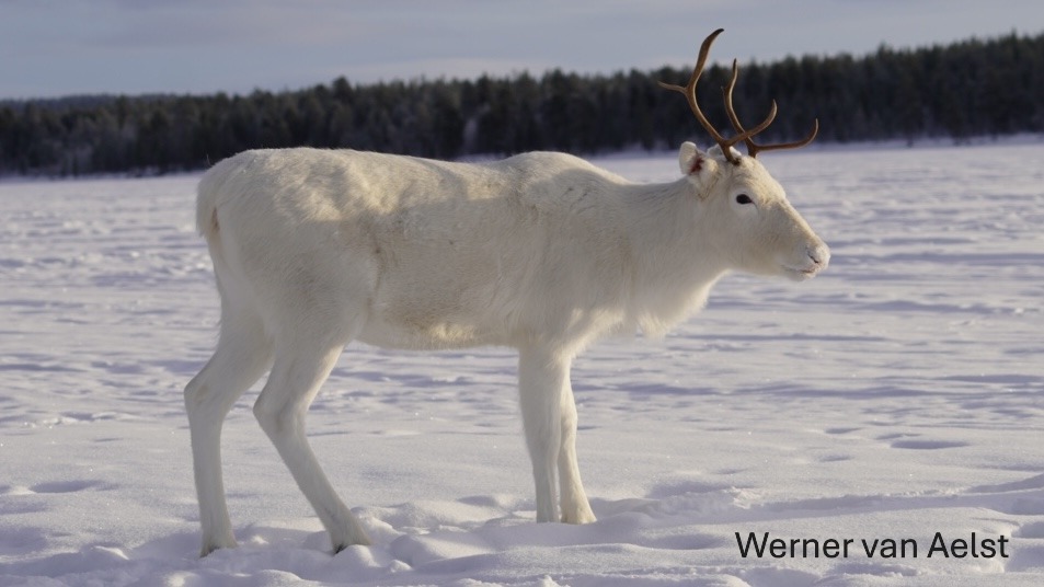 Snow-white & a dark colored reindeer roaming free on our frozen Home Lake. Beautiful photos are taken by our guest.